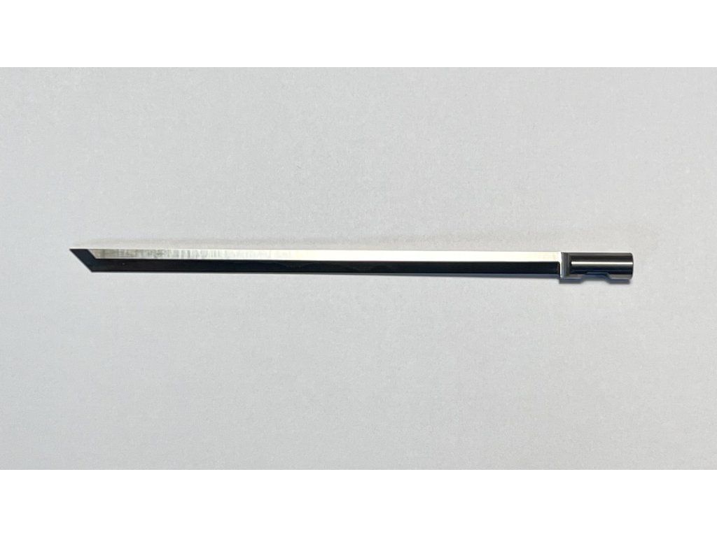 Nůž má vespod úkosné zakončení, aby snadno pronikal do materiálu.